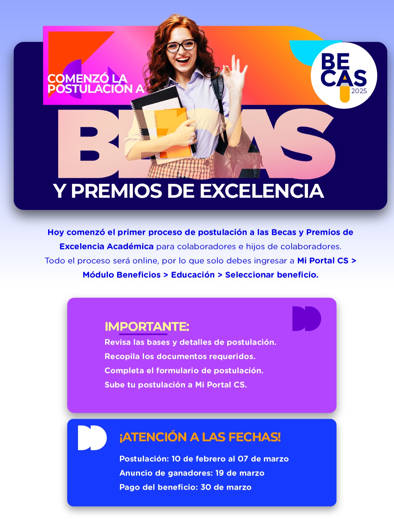 Nos complace informarles que ha iniciado el proceso de postulación para las Becas y Premios de Excelencia Académica, dirigido a colaboradores y a hijos de colaboradores. Este beneficio es una oportunidad importante para apoyar la educación y el desarrollo académico de nuestras familias.
