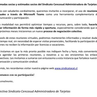 Estimados compañeros y compañeras: A continuación, les informamos sobre los avances y respuestas a los temas tratados en la última reunión sindical: 1. PERMISO BACK UP EASY Y JUMBO 2. CAPTACIÓN PARIS PUERTO MONTT 3. NUEVA HERRAMIENTA PARA CAPTACIÓN 4. ENCUESTA DE CLIMA LABORAL 5....